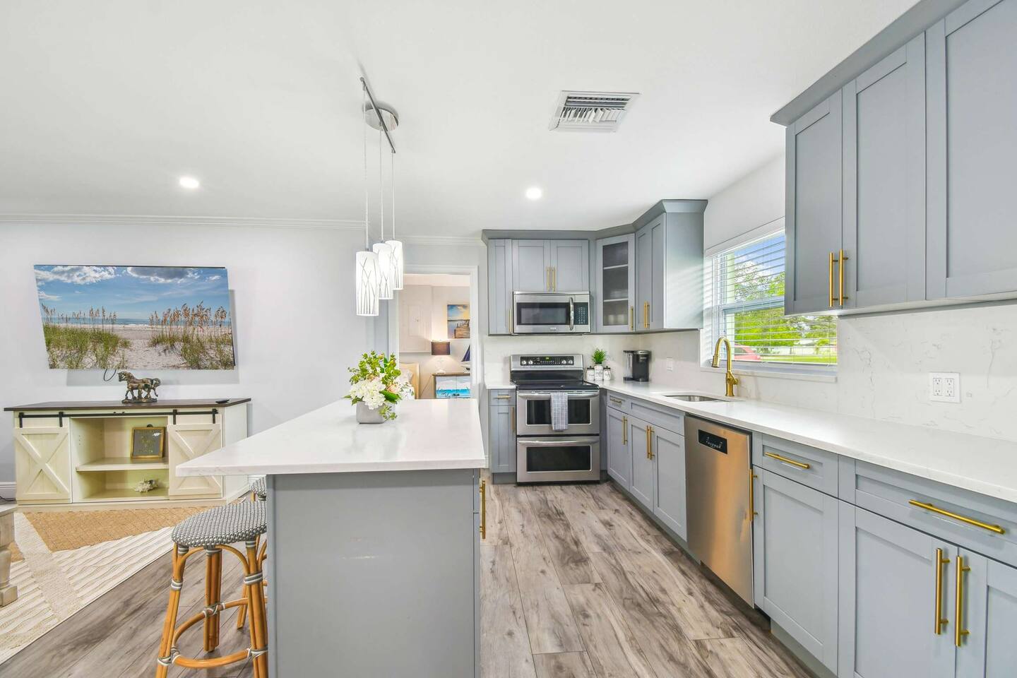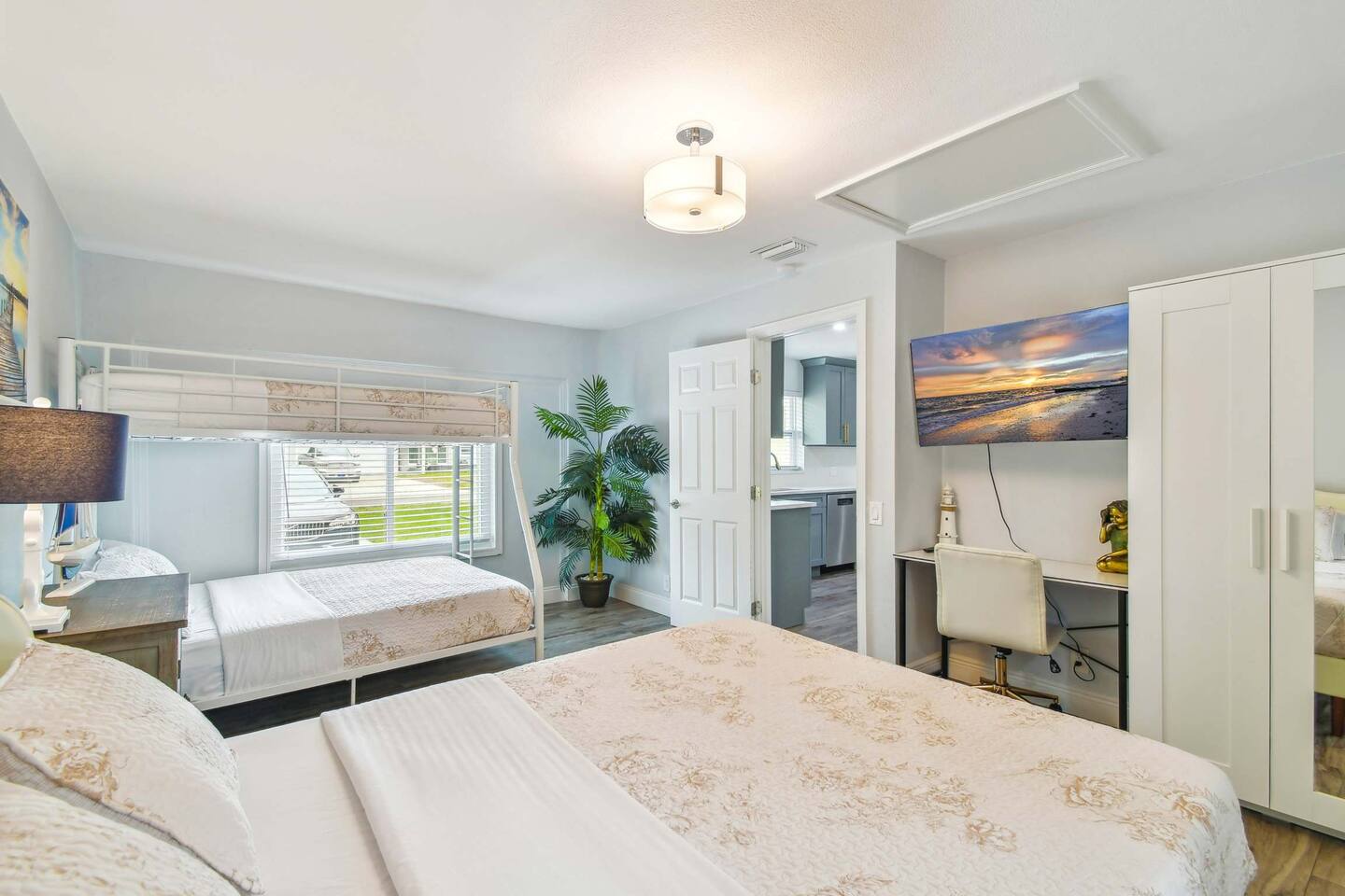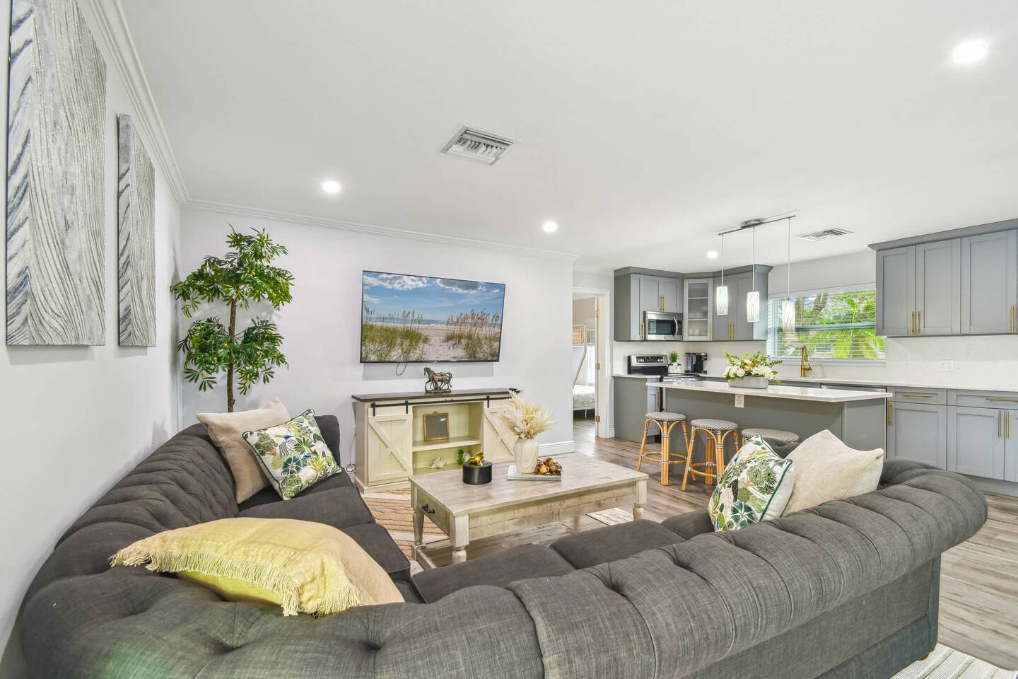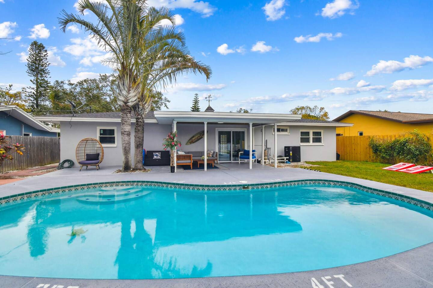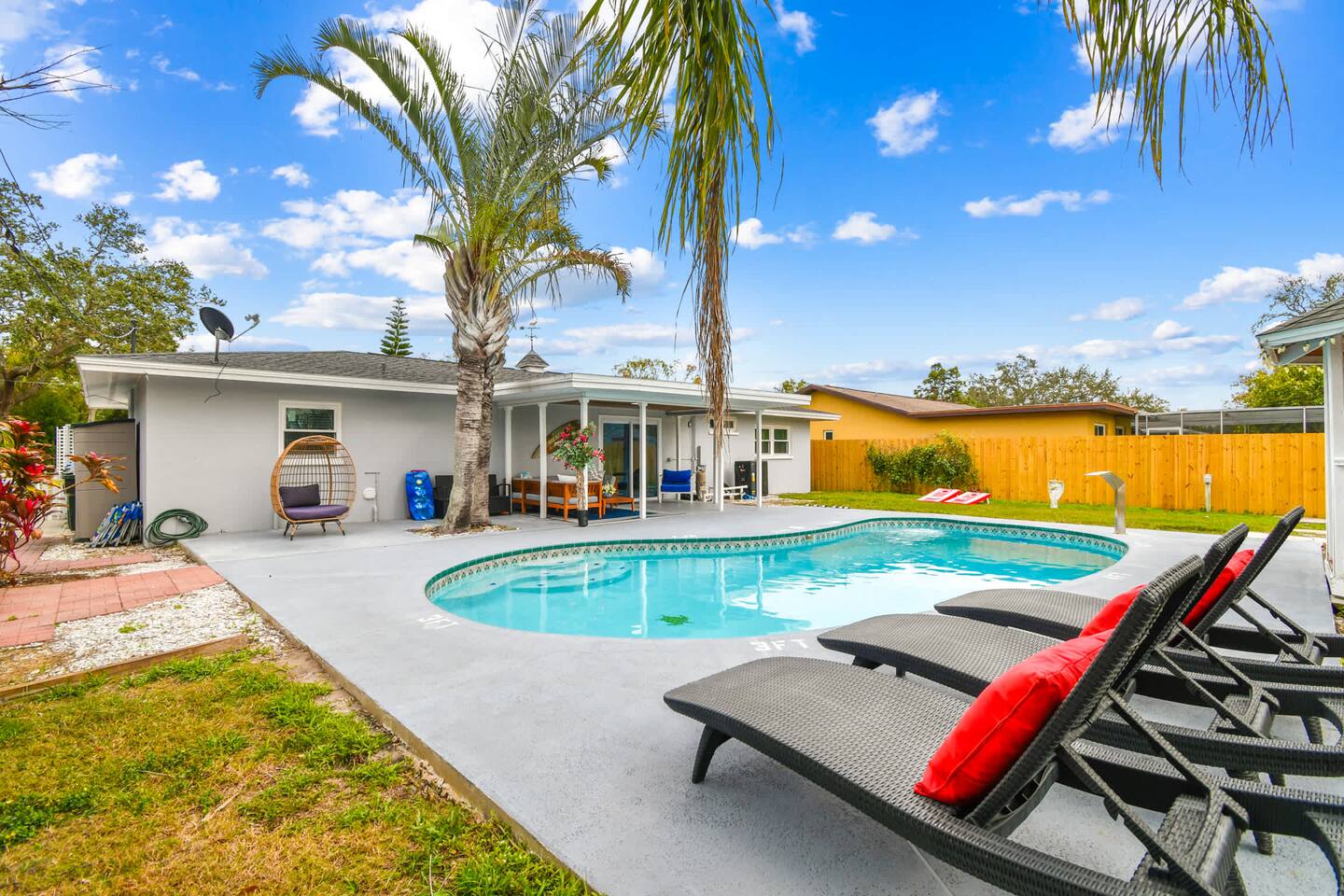 🌴 Bedrooms & Bathrooms •3 Bedrooms: King, 2 Queens, Queen + bunk bed •3 Bathrooms: Fresh linens, towels, toiletries provided •Extras: Fully equipped kitchen, spacious living room with HDTV & WiFi, in-unit washer/dryer (detergent provided) ✨ Highlights & Amenities • Heated pool & outdoor firepit • Shaded gazebo & BBQ grill • Pet-friendly (fee applies) • Baby-friendly: high chair & pack n play • Beach essentials: chairs, umbrella, towels • Free on-site parking 🏖 Nearby Attractions • Indian Rocks Beach → 5 min • Clearwater Beach → 13 min • Madeira Beach → 15 min • St. Pete Downtown → 25 min • Pinellas Trail → 5 min